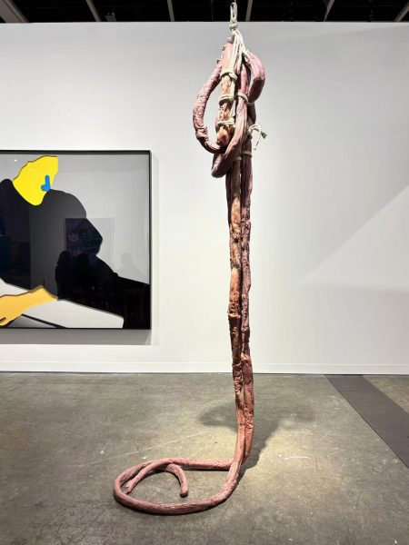 This suspended work echoes her monumental installation at Tate Modern, where silicone tentacles and dripping surfaces created a haunting “skin factory.” Here, it appears as an early prototype of that immersive environment.