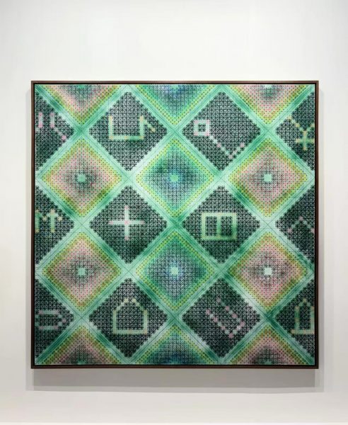 In this work, thousands of “+” and “×” marks accumulate into a vibrant, shifting diamond pattern—systematic yet far from mechanical.