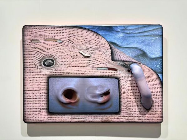 In this multimedia work, a fleshy surface peels back to reveal hidden layers beneath, with cavities and protrusions evoking fragmented bodily forms.