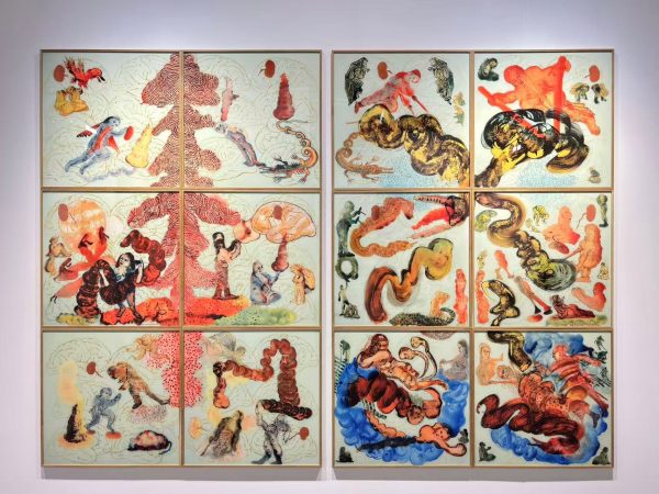 This painting unfolds across a 12-panel grid like a mythic dreamscape, where hybrid figures drift through softly colored zones, linking narrative fragments from one panel to the next.