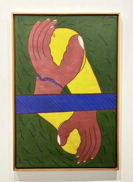 Yet her subject matter is radically different: deeply personal, unflinching explorations of sexuality, desire, and trauma. In this work, mirrored hands grasp symbolic, gendered forms within a green field—both intimate and confrontational.