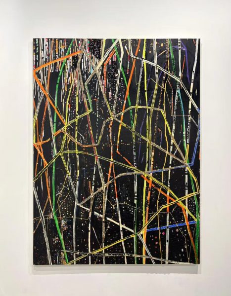 Huang Yuxing reimagines the hidden interior of data centers. His large-scale painting depicts a glowing underground world where electric colors surge through layered terrains and channels.