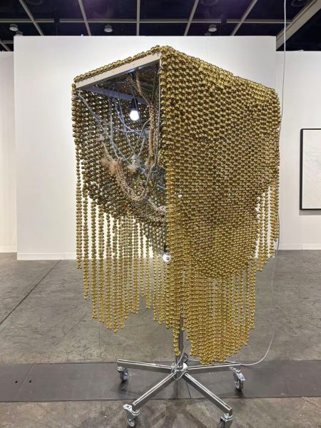 In this work, hundreds of small brass bells hang from a metal structure, forming what the title suggests: a shimmering “sonic fabric.” Mounted on wheels and interwoven with wires and light bulbs, the sculpture feels as if a passing breeze could set it gently ringing.