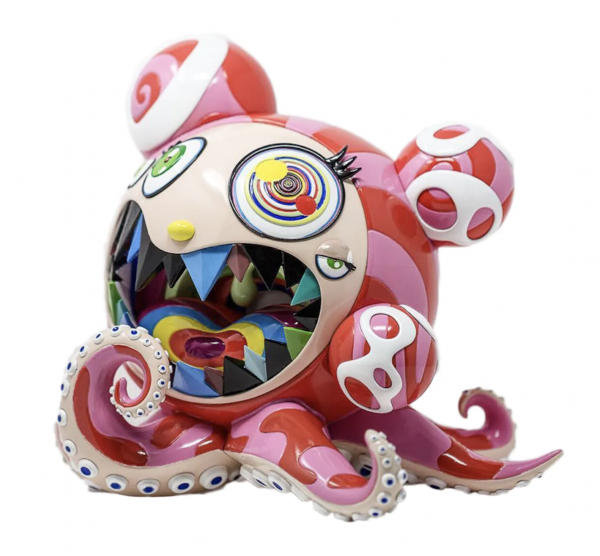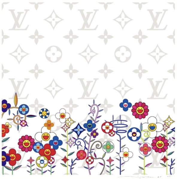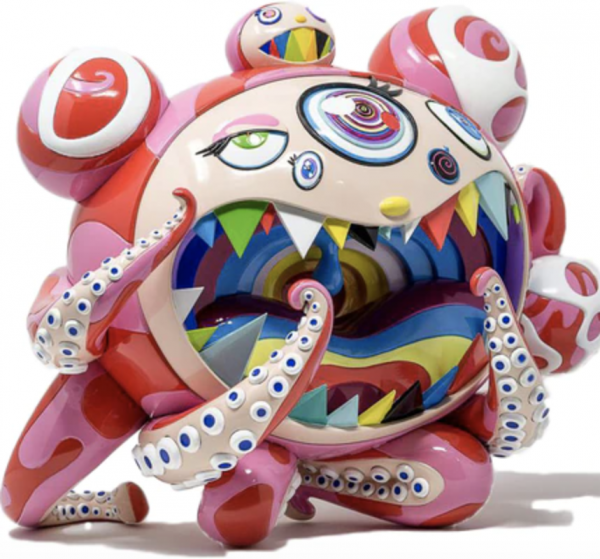 Murakami’s recurring characters each represent a different part of his psyche and were originally created as a statement that Japanese art doesn’t need to imitate American art, and should find its own means of expression. In 2002, Murakami was invited to collaborate with fashion house Louis Vuitton on a series of accessories, for which he reinvented their signature monogram in a variety of candy-colored hues. Murakami later re-appropriated the monogram into his own work, further blurring the boundaries between high art and popular culture.